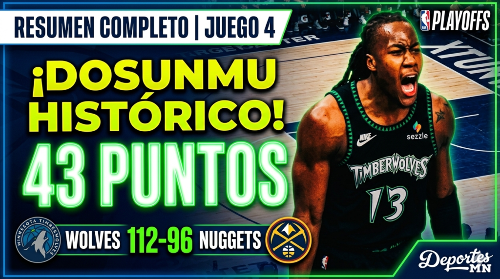 🔥 La noche de su vida: Ayo Dosunmu explotando desde la banca para firmar su récord personal de 43 puntos, siendo completamente inalcanzable para la defensa de Denver. 🧱 Dominio total en la pintura: Cómo Naz Reid (17 PTS, 9 REB) y Julius Randle (15 PTS, 9 REB) controlaron los tableros ganando la batalla de los rebotes 60 a 51. 🚫 Conteniendo al campeón: La labor defensiva y el ritmo de los Wolves para neutralizar los esfuerzos de Jamal Murray (30 PTS) y dejar a Nikola Jokić a un paso del triple-doble, pero sin respuestas en el marcador final.