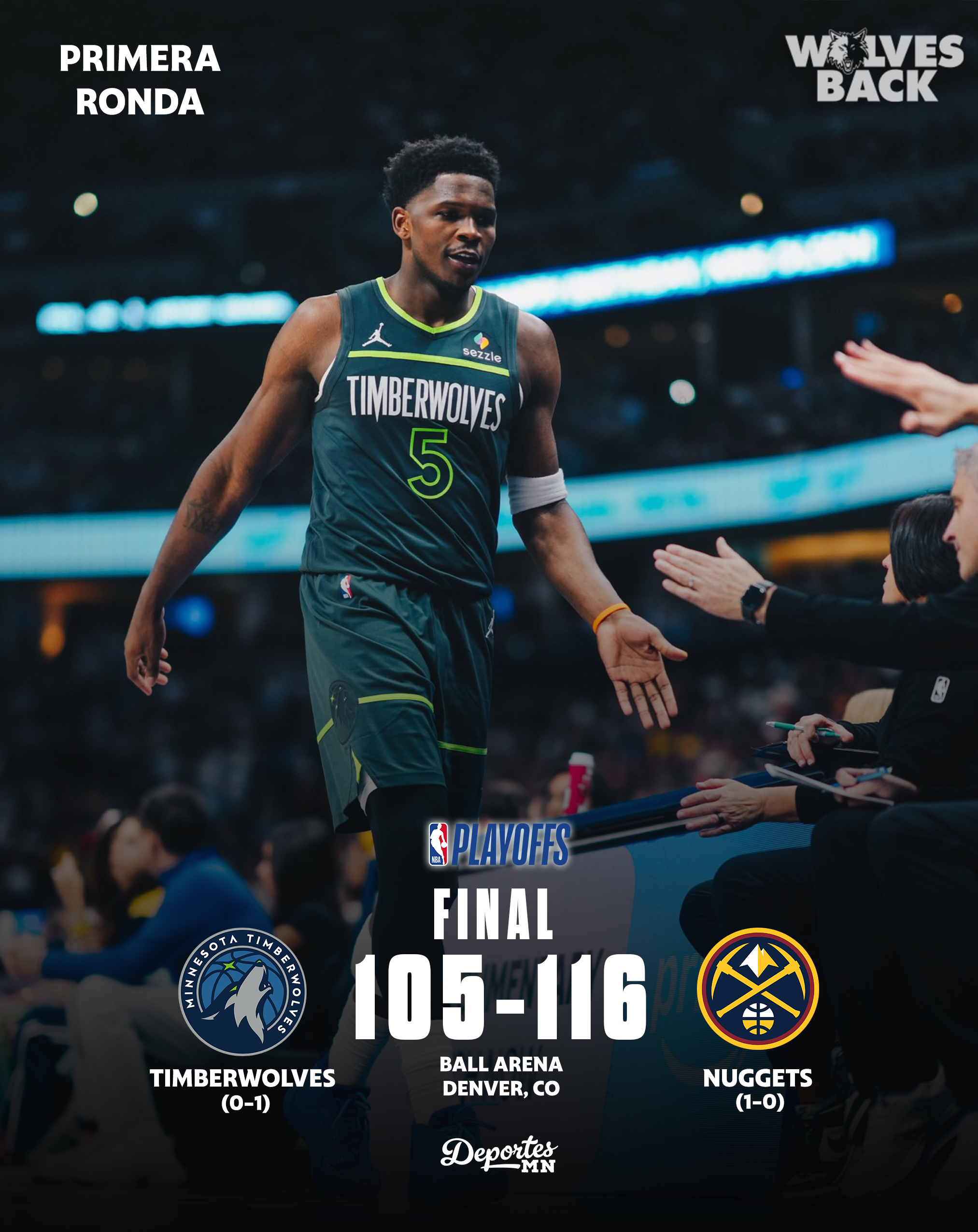 En un inicio de serie electrizante en el Ball Arena, los Denver Nuggets hicieron valer su localía al derrotar 116-105 a los Minnesota Timberwolves. Con este resultado, el equipo de Colorado toma la ventaja 1-0 en la Primera Ronda de los Playoffs 2026.