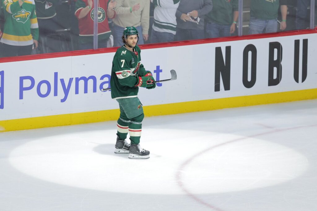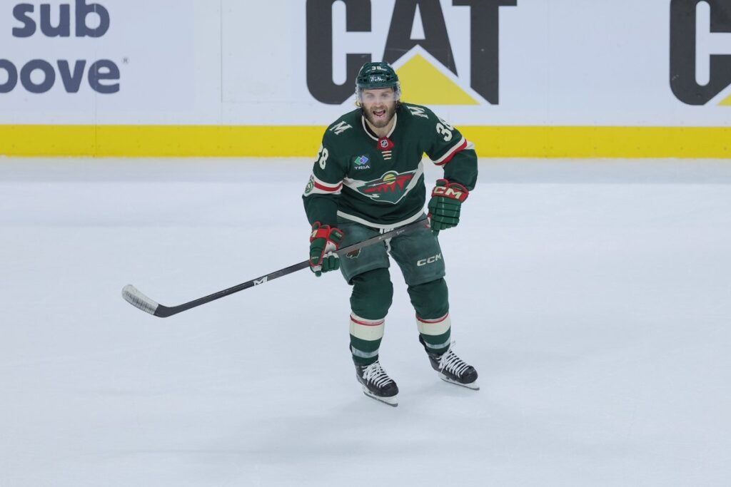 - Matt Boldy, el hombre al que le habían robado dos goles, desvía el disco con la punta del stick.