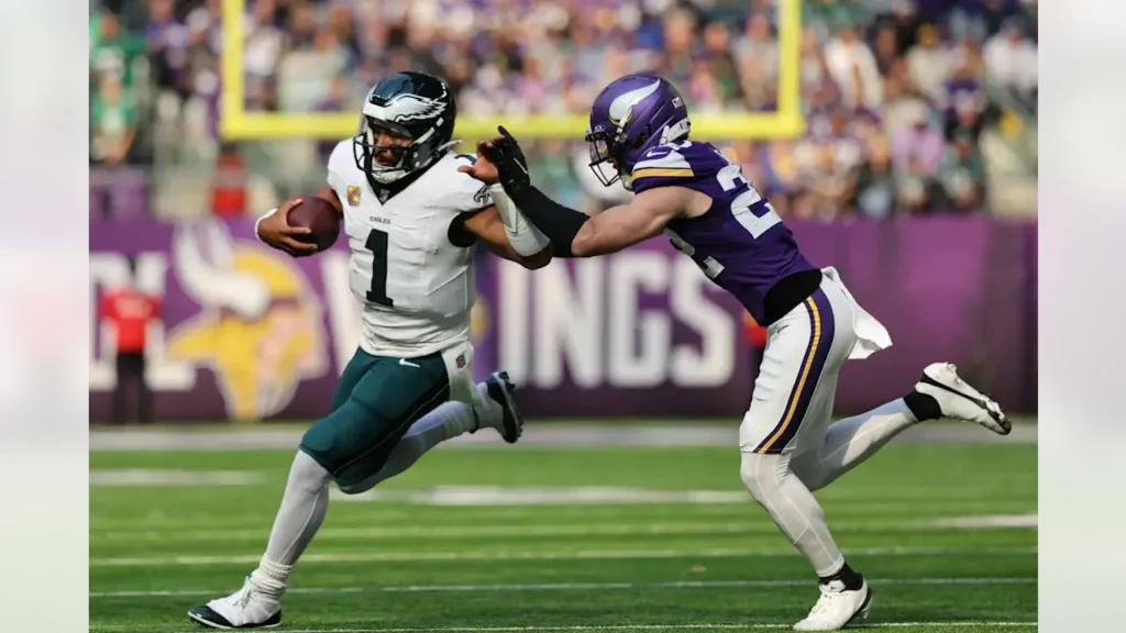 Hurts encendió a los Eagles con 326 yardas de pase y tres touchdowns. Jalyx Hunt contribuyó con una intercepción para touchdown, y Filadelfia (5-2) se recuperó de derrotas consecutivas para derrotar a los Minnesota Vikings 28-22 el domingo.