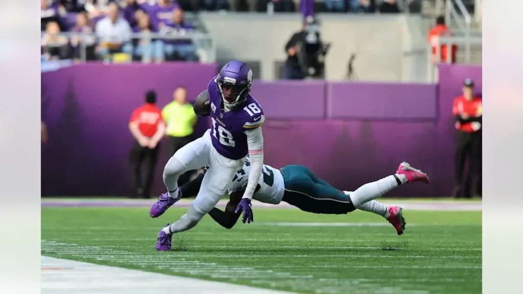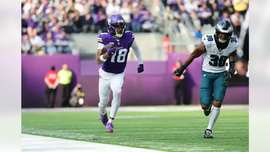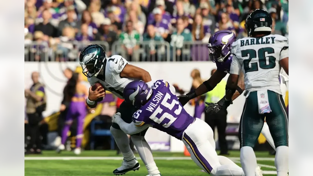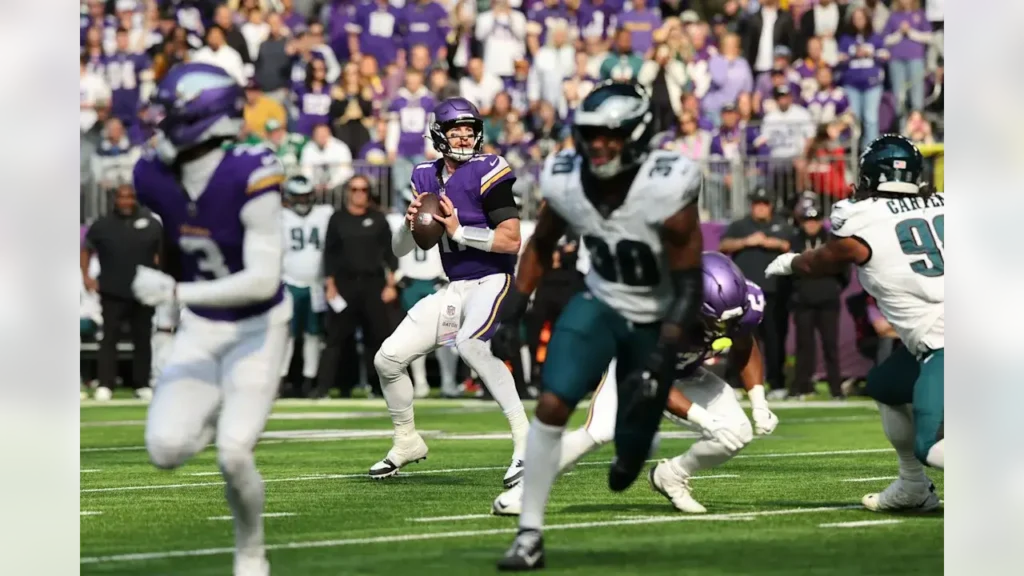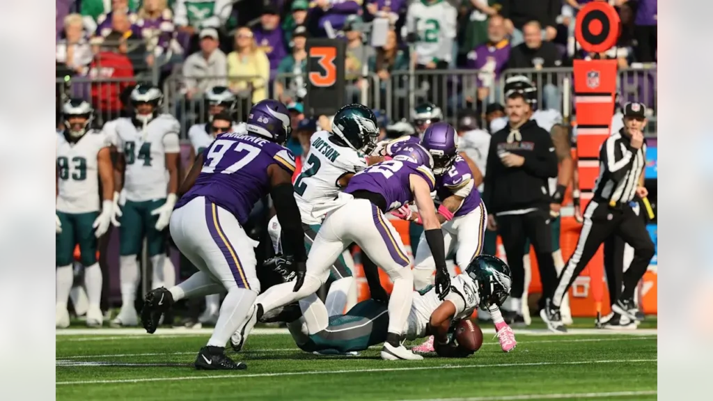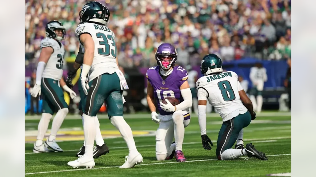 Con 1:45 restantes y los Vikings (3-3) con dos tiempos muertos, Hurts selló la victoria en tercera y 9 desde la yarda 44 de los Eagles, entregando un arcoíris de 45 yardas a Brown, quien superó a su ex compañero de equipo Isaiah Rodgers. Rodgers, en su primera temporada con los Vikings, también fue superado en el touchdown de Smith.