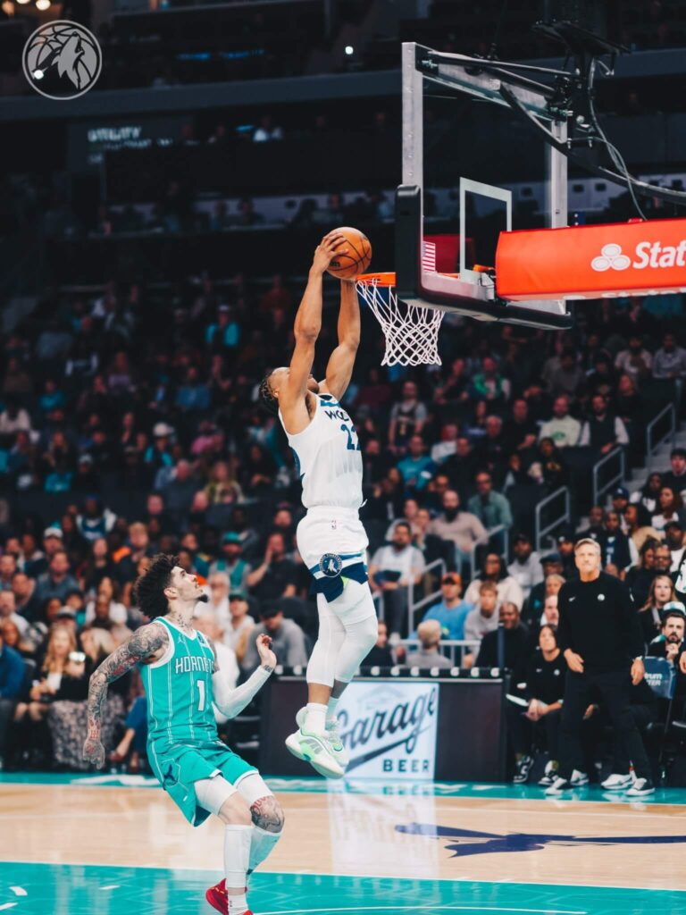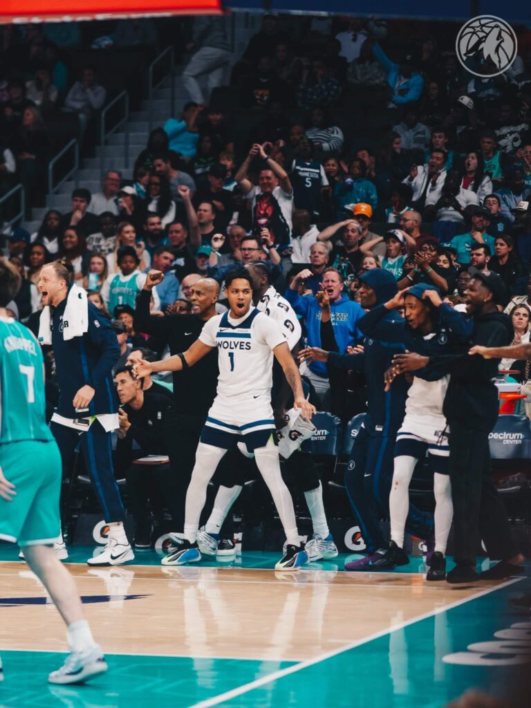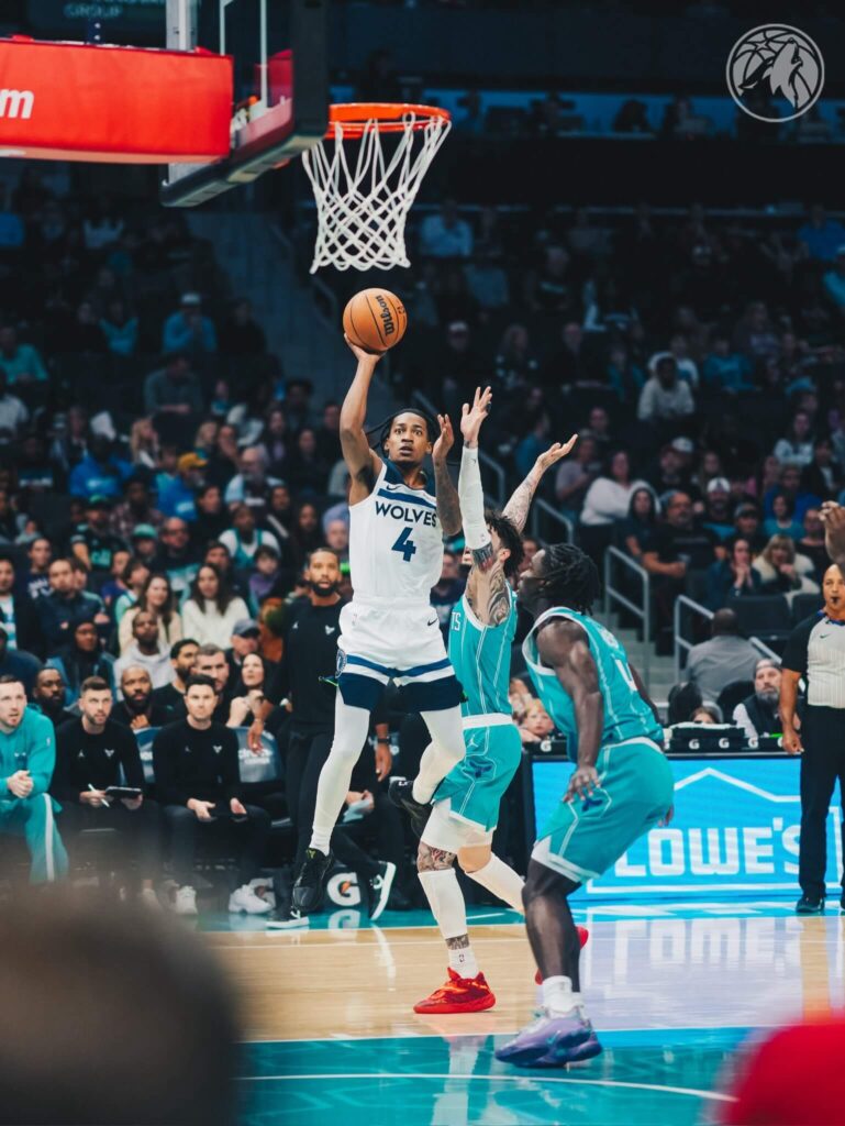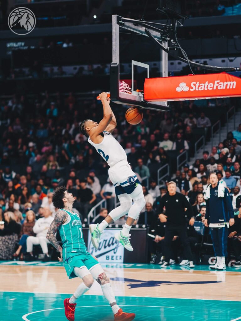 El escolta de los Timberwolves, Rob Dillingham, jugando en su segundo partido de carrera cerca de su ciudad natal de Hickory, Carolina del Norte, contribuyó con cuatro puntos y tres asistencias en 15 minutos.